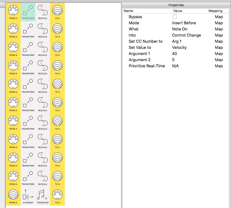 I’m using the ‘transform’ modifier to turn velocity values into the CC values of the drum part amp levels on the Volca Beats. It kind of works, but there is a slight delay before the transformed value kicks in. This means if I hit the note with high velocity, and then a second time with low velocity, I get a short loud snap at the beginning of the second hit.