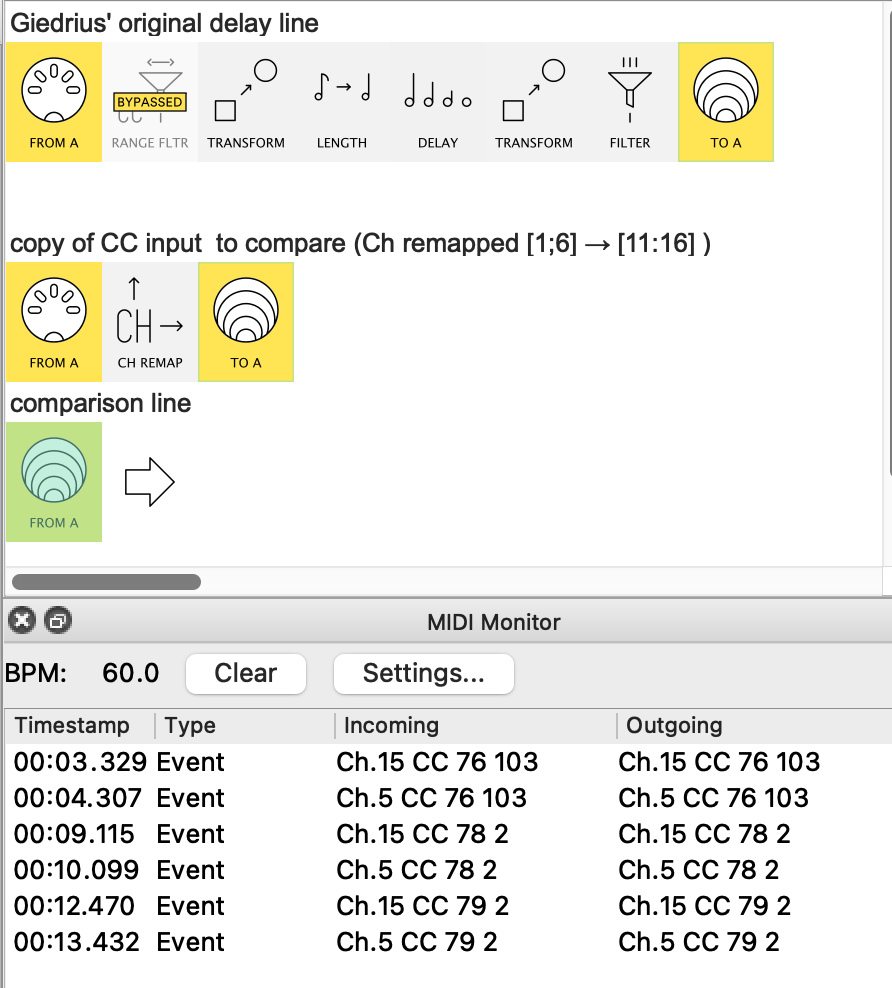 In the shot above, you can see the Monitor also showing my Ch.5 CCs – with the originals remapped to Ch.15 for comparison. As you can see, the CCs are delayed by about a second @60BPM.