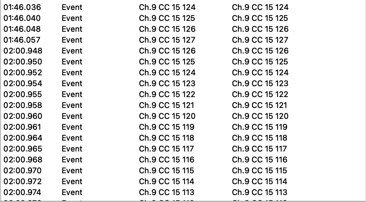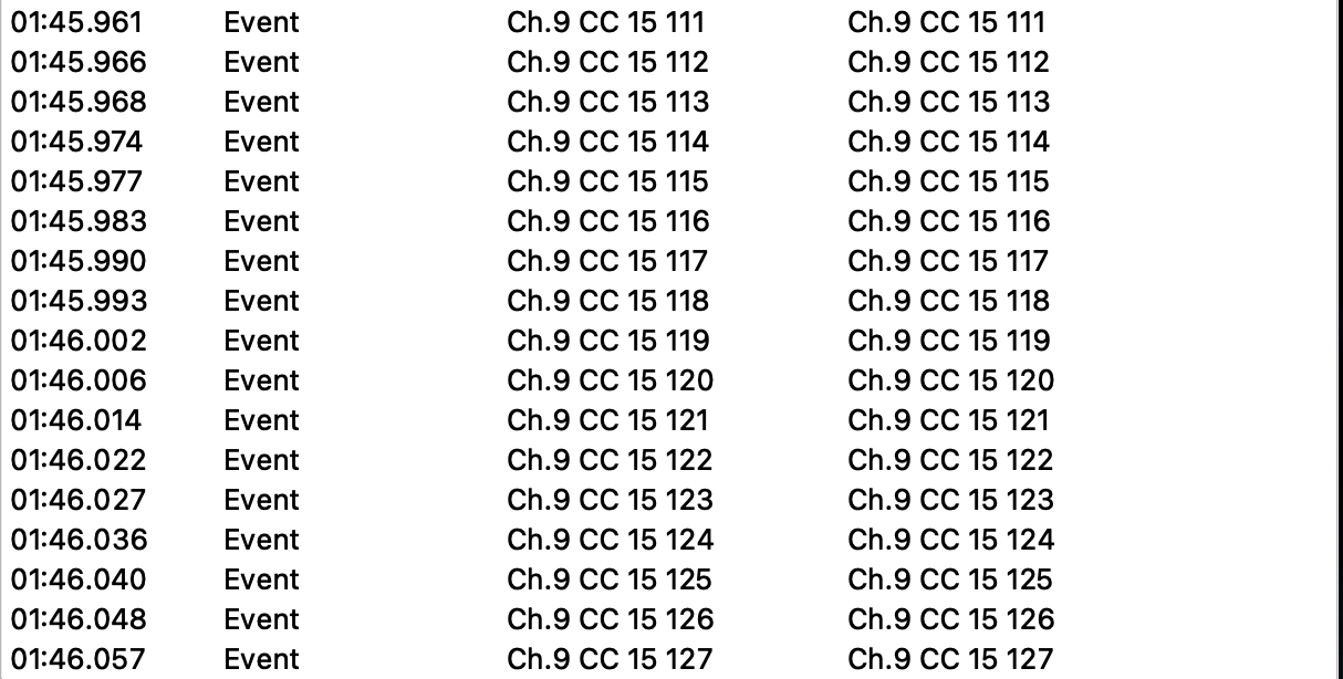 CC 103 is going back to the pedal set yes. That message is used to turn on and bypass the pedal, (CC 103 =0 is the bypass, CC103= 1 or greater equals turning on). The CC 15 messages are also going to the pedal and are used to control the wetness of the mix once the pedal is on.