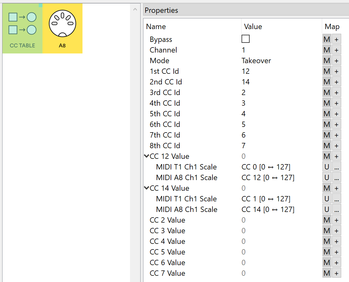 This is set up to share controls of Distortion (CC #12) and Osc 1 Tune (CC #14). The remaining 6 CC Table slots are in default state, ready for customization.
