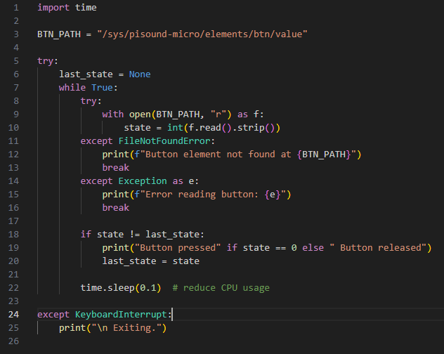 also, I tried “pollgpio /sys/pisound-micro/elements/btn/value”