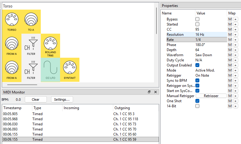 for starters i am just trying to modulate the volume on cc95 on the syntakt while synced to the bpm.