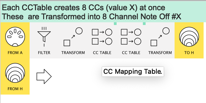 BTW I was pulling my hair out figuring out the CC# values for Ch1 - Ch16. Turns out Ch1 = 1, Ch8 = 56 and Ch16 = 127. Transpose -12 semitones = 52, -24 semitones = 40, -36 semitones = 28 and -48 semitones = 16 !!! It took me many tries to figure it out and this is NOT explained anywhere. All I found was info about 0-63 and 64-127 for check boxes (disable pipelines).
