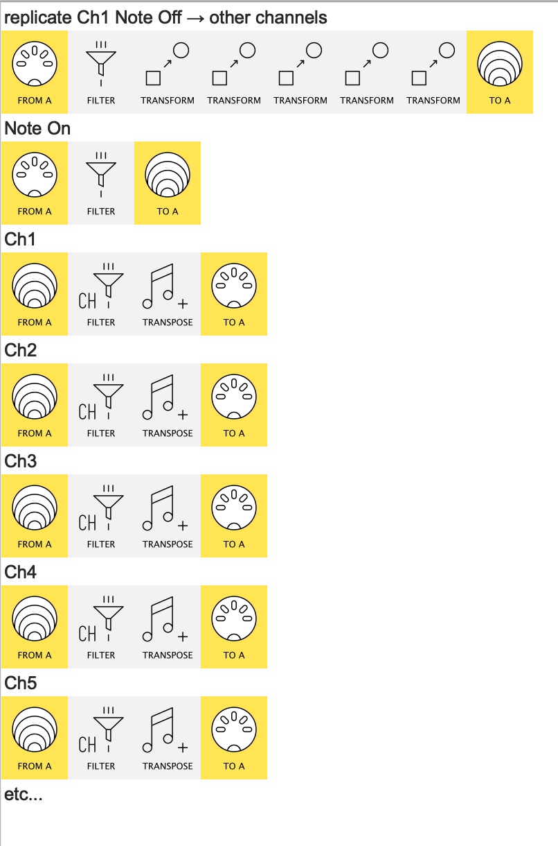Thanks for the reply! The Re-303 bug sends midi notes as note On + vel XX CH X followed by an note Off vel O CH1. Synths maybe ignore occasional note offs but these note offs are not occasional but permanent and my drumcomputer certainly does not like CH10 on’s and CH1 off’s. To explain the cable bit: I duplicated the pipes with the note off set to a fixed channel and added a transpose pipeline -1, -2, -3 and -4 octaves with their own output A-D. By switching the midi cable into output A~D, the notes are transposed -1~-4 octaves.
