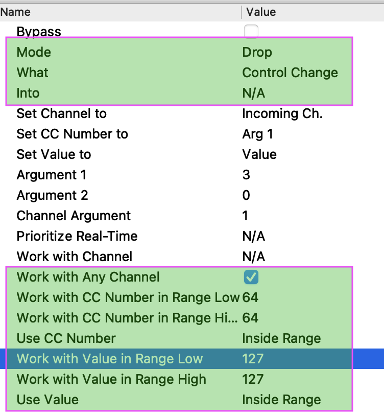 So, is it possible to not allow the pedal on (64 value 127) to pass through and only allow the 64 value 1 to pass? That way, I could solve the problem… I suspect that the Transform pipeline should be used, but this object is still a bit obscure to me…