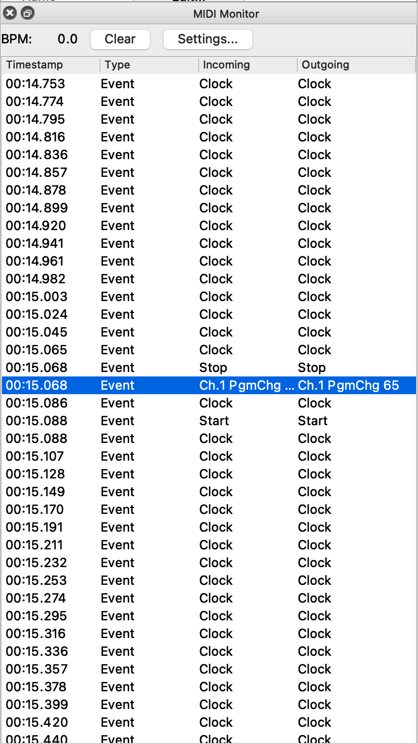 The sequence of events seems to be as expected - there’s a Clock event between the Stop and Start events that the Elektron device would have missed during the requested Program Change, but the Sync Delay compensates for it immediately after Start event goes through it, and then the Clock events continue in roughly 21ms period.