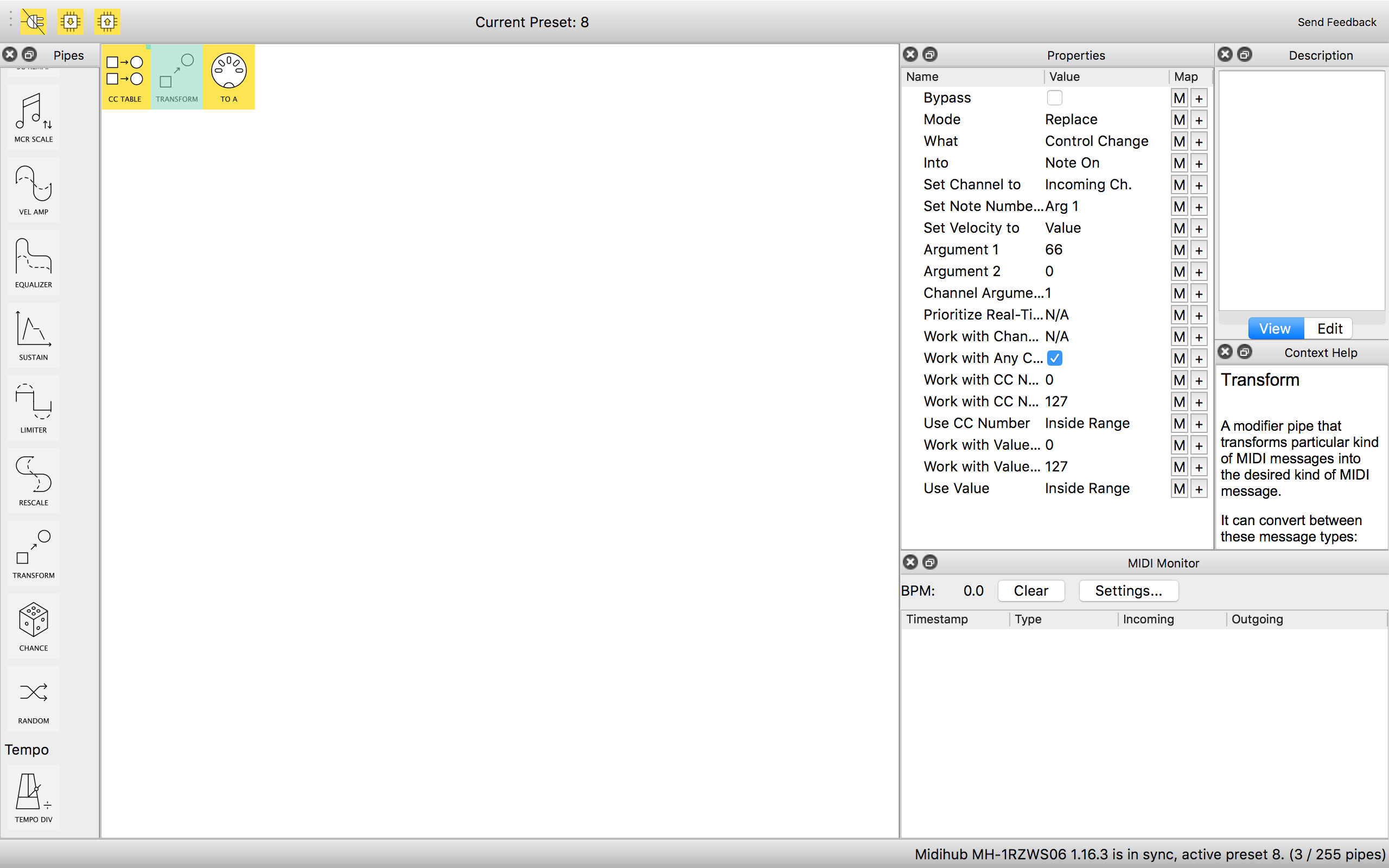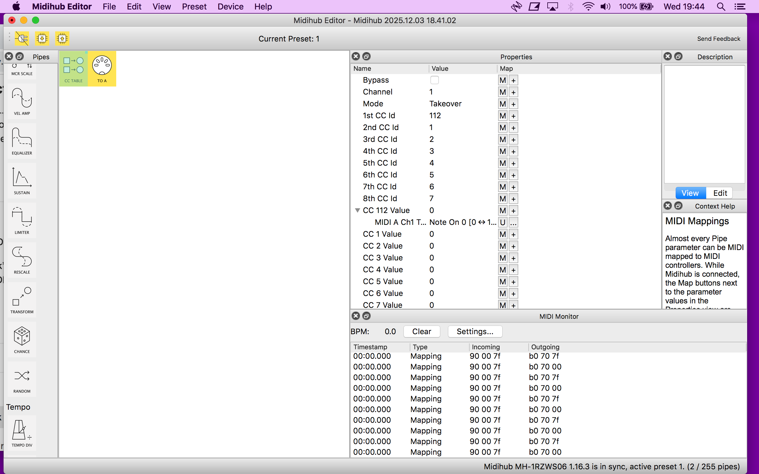 Could you show MIDI Monitor output on any of the pipes in the preset when you toggle?