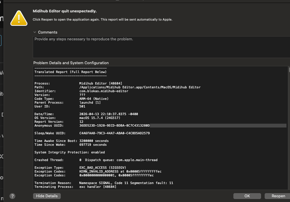 Hi, this sounds like the issue reported here: Midihub editor crashes often (macos tahoe 26.2)