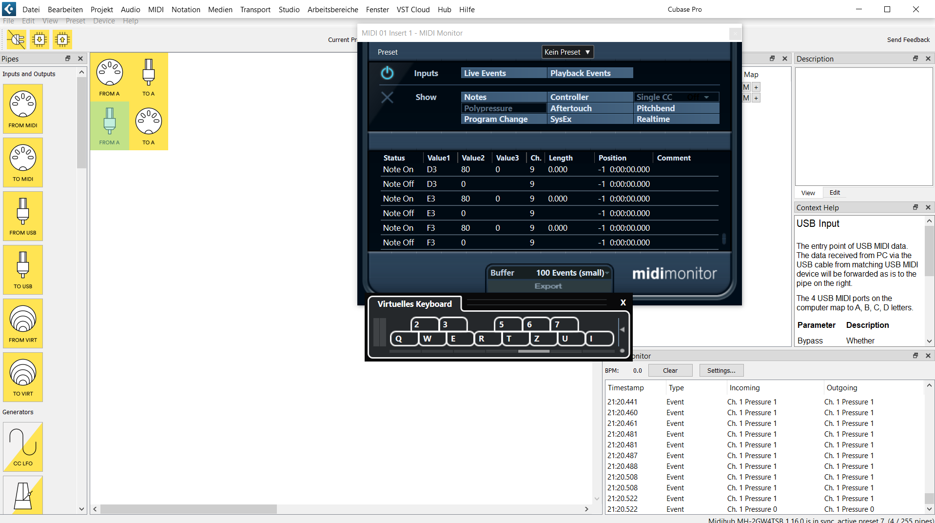 I send Midi notes from my DAW to Midihub USB Port 1 (Cubase, verified using midi monitor). In the Midihub editor Monitor I see that instead of the output Midi notes, a vector of channel pressure data appears. The vector is always identical, rising from 0 to 12 back to 0