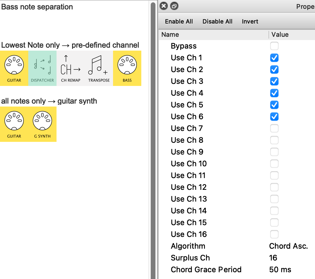 A Channel Remap further down the line would then separate (and “re-channel”) the bass note to send it out the correct port. This would also you to independently set the Note Length if that’s useful.