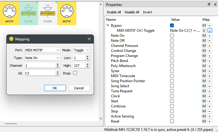 Preset 1: Two (dummy) Filter Pipes both with a Mapping that toggles Bypass On/Off by C3 Note On