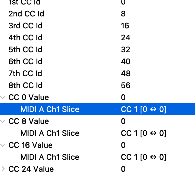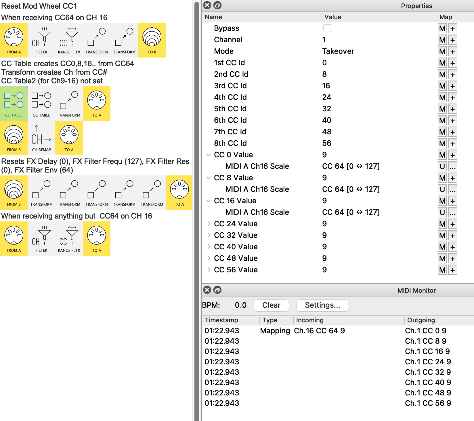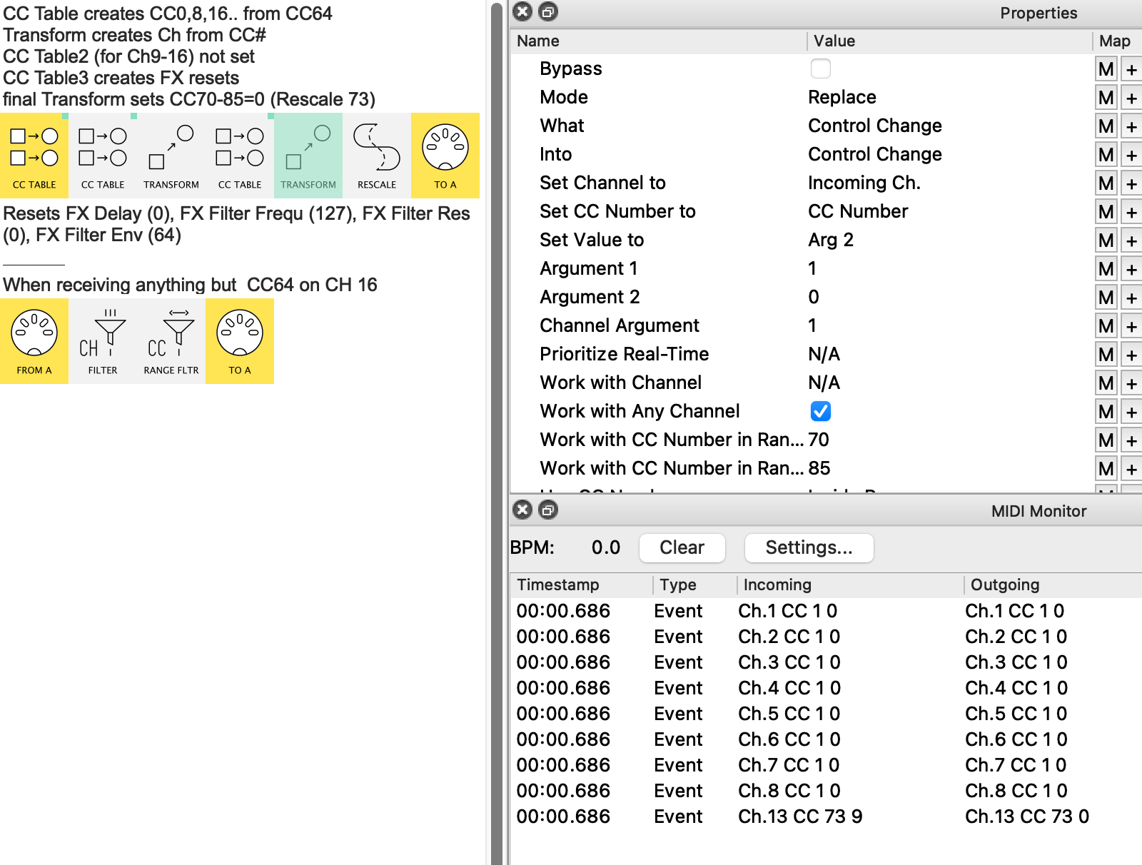 The selected Transform replaces the CCs 70-85 with zero values (see the last Monitor line ~ I’ve set just one of the CCs as a demo)