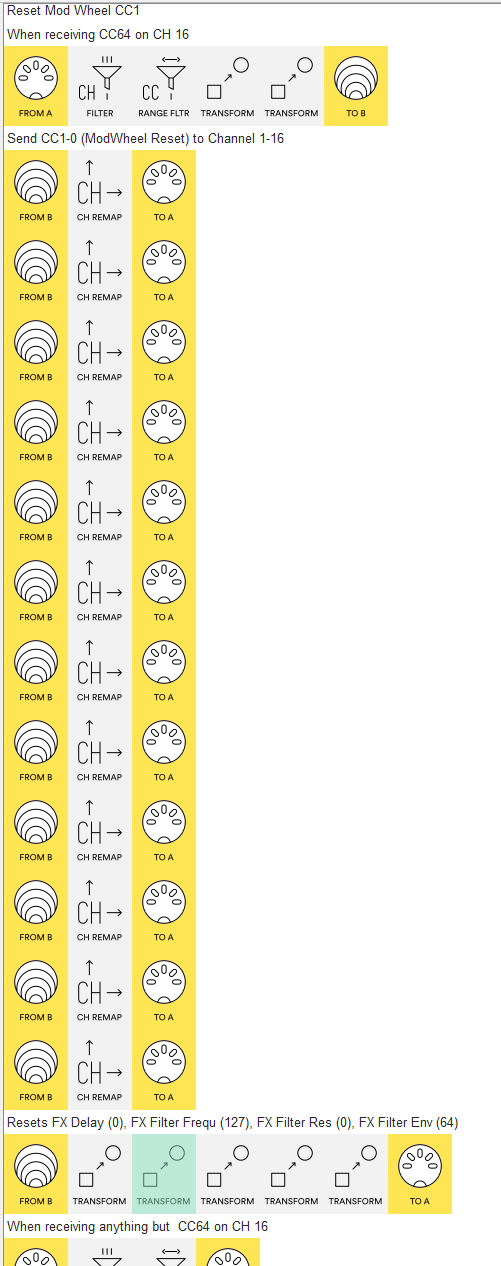 (I realised a few hours later, for example, that you likely won’t even need the extra Transform & Rescale after the “CH13 FX CC Table”: experiment with using mappings set to Clip and a single value range (0/64 in your cases))