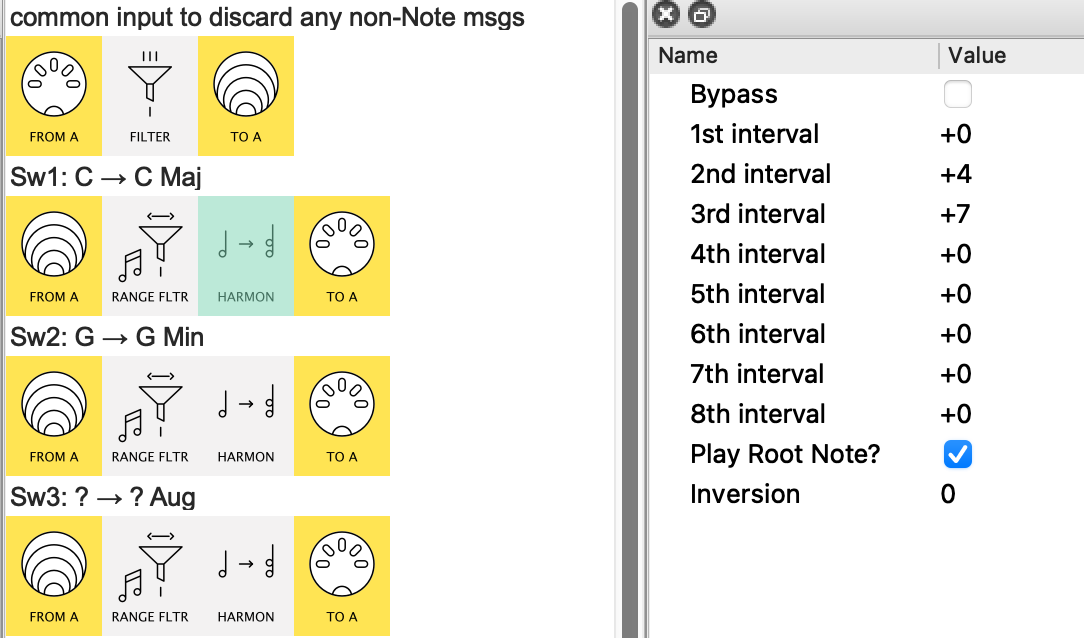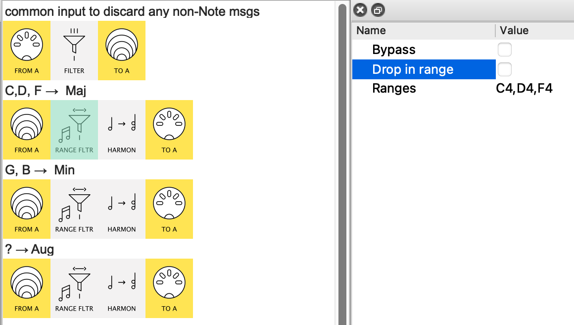 …this Note Range Filter allows C,D & F through to the Major chord Harmonizer.